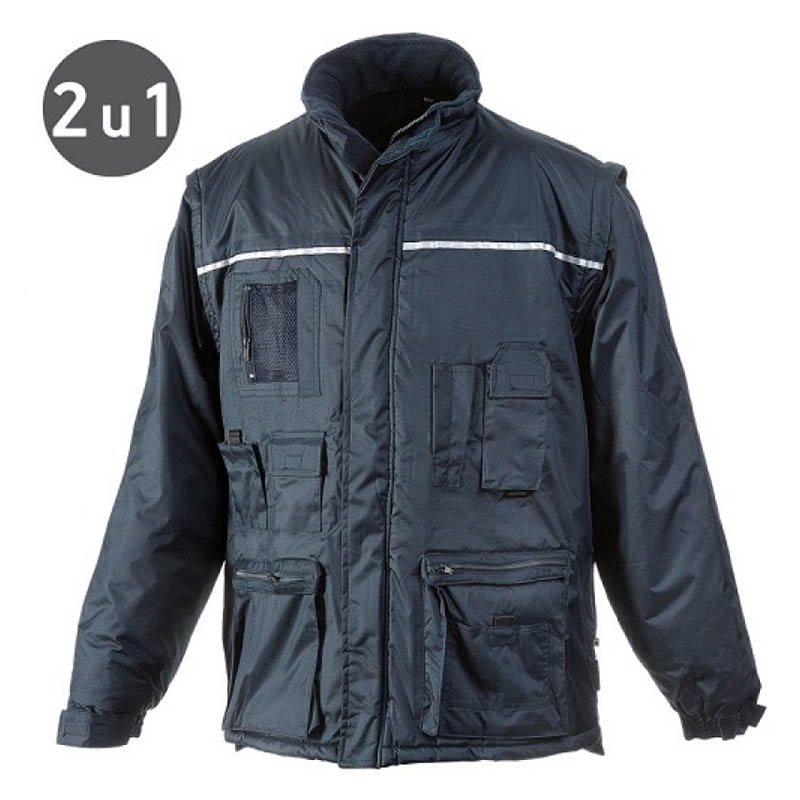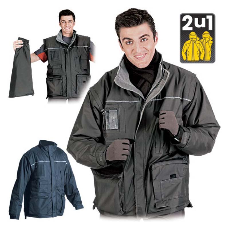 Zimska termo, vodonepropusna jakna, materijal 100% poliester sa slojem PVC-a, 190 g/m2, kopčanje zipom i čičak trakom. Rukavi jakne se mogu skinuti, dostupna je u dve boje.
