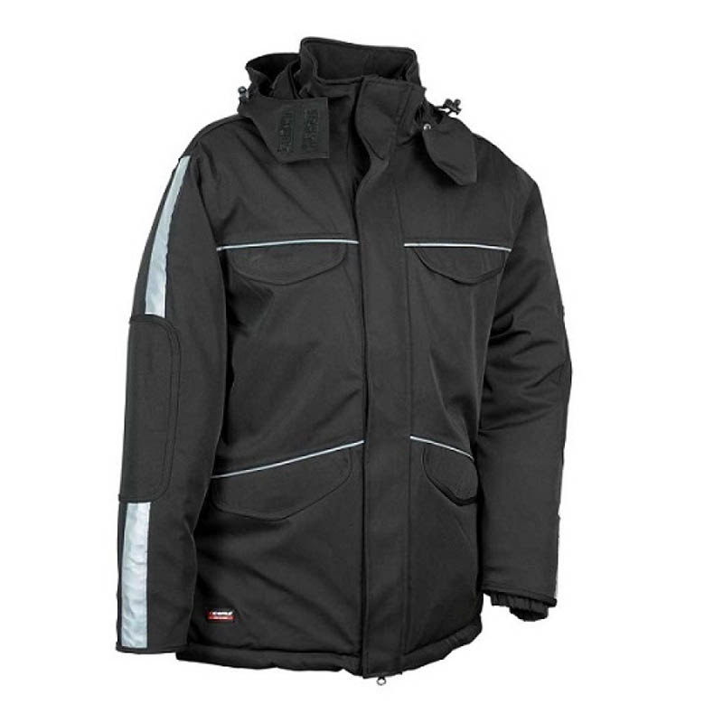Muška zimska vodoodbojna jakna. Površinski sloj je izradjen od mešavine materijala 94% poliester i 6% elastin, 250 g/m². Jakna ima specijalnu COFRA-TEX membranu koja sprečava prodor vode iz spoljašnje sredine, a omogućava koži da diše. Postava sa punjenjem od 160 g/m² obezbeđuje termoizolaciju i zaštitu od hladnoće. Poseduje reflektivne 3M™ SCOTCHLITE™ detalje, kapuljaču sklopivu u kragnu, varene šavove, ojačanja na laktovima, praktične džepove i kopčanje patnet zatvaračem zaštićenim preklopom. Pogodna za upotrebu u poljoprivredi, aerodromima, građevinarstvu, industriji, logistici, gde je neophodna otpornost na kišu i vetar, pogodna za hladna okruženja. U lagerskoj ponudi jakna je dostupna u kombinaciji boja: crna i teget-plava, a po porudžbini dostupna i kao crna-antracit i braon-crna.