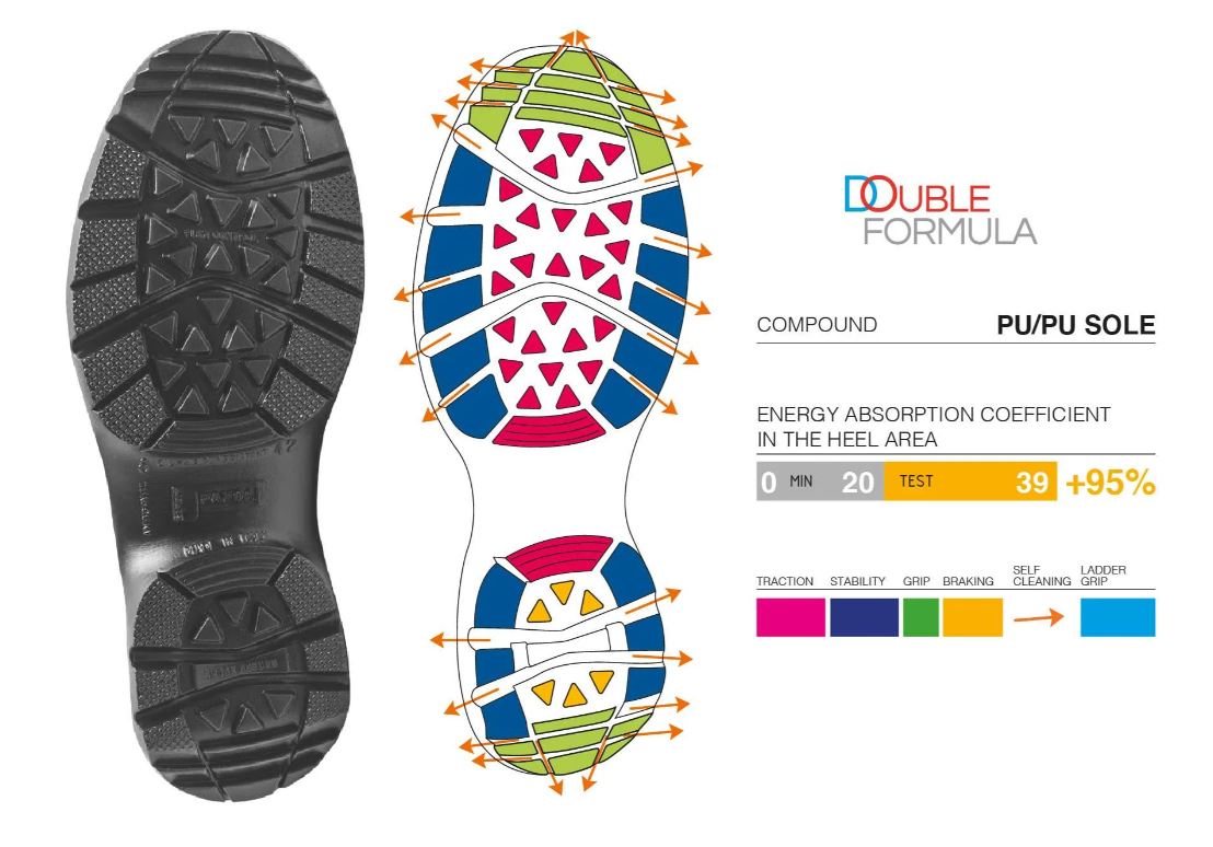 - Đon: PU/PU, SR protivkliznost, samočisteći kanali, anti-torsion, visoka apsorpcija energije pete.