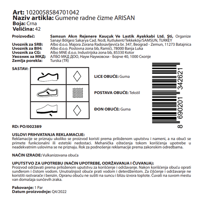 Gumene radne čizme crne boje sa tekstilnom postavom. Guma je izuzetno izdržljiv materijal, zahvaljujući kojem su Arisan čizme otporne na toplotu, abraziju, probijanje i cepanje u većoj meri nego što su klasične PVC čizme. Poseduju protivklizni đon sa apsorberom energije u oblasti pete, koji smanjuje umor u stopalima usled dugotrajnog stajanja i olakšava kretanje. Duboke šare na đonu koje obezbeđuju udobnost i stabilnost na neravnom terenu.