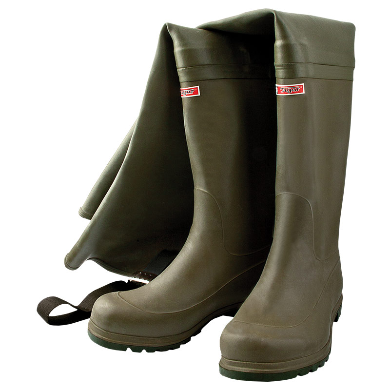 Duboke ribarske čizme proizvedene od gume sa tekstilnom postavom, zelene boje. Čizme sa spoljašnje strane pri vrhu imaju kaiš sa metalnom kopčom, protivklizni đon ima apsorber energije u oblasti pete.