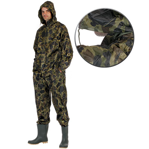 Vodootporno kišno odelo iz dva dela, sa maskirnim dezenom, napravljeno od 100% poliestera sa slojem PVC-a, kapuljača se pakuje u kragnu, šavovi su šiveni i vareni, isporučuje se u praktičnom pakovanju.