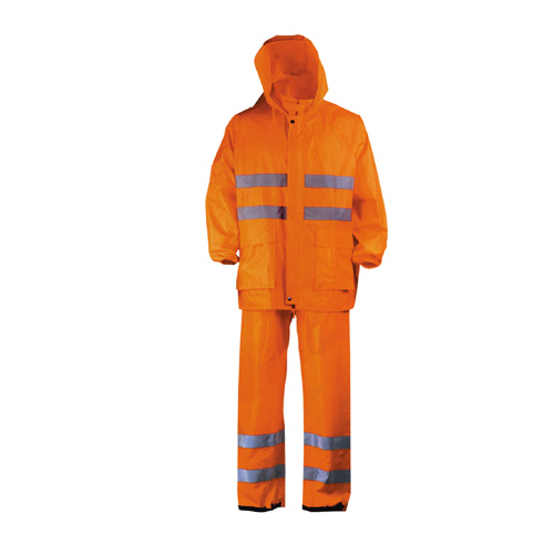 Kišna fluoroscentno narandžasta odeća izrađena od materijala sa poliesterskom osnovom i PVC premazom. Šivena sa lepljenim šavovima, vodonepropusna i sa fluoroscentnim trakama.