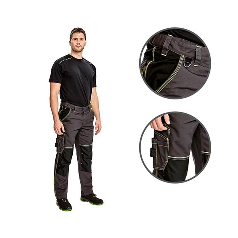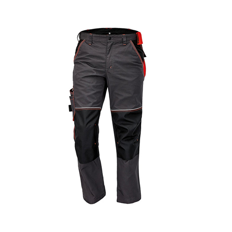 Radne pantalone proizvedene od 35% pamuka i 65% poliestera, 270 g/m2, , praktični džepovi, Oxford 600D ojačanja na mestima izloženim većem habanju. Kombinacija boja; tamno siva-žuta; tamno siva- narandžasta; tamno siva-crvena;