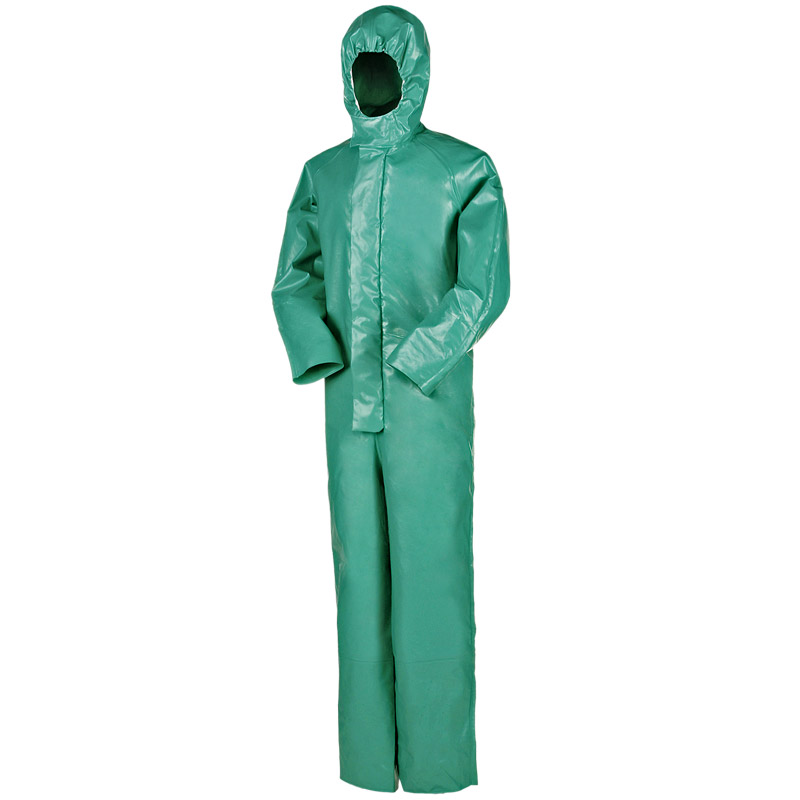 Višekratni hemijski kombinezon renomiranog proizvođača SIOEN, proizveden od Chemtex materijala (poliester tkanina obostrano obložena PVC-om, 360 g/m2) je odlično rešenje za intenzivnu upotrebu u industrijskom okruženju. Posebno je otporan na cepanje. Štiti od tečnih hemikalija, ulja i maziva. Ima elastične manžetne u rukavima i na člancima. Bez postave. Kapuljača je fiksirana za odelo, zatvaranje je rajsfešlusom pod duplim preklopom sa čičkom i drikerima. Raglan rukavi. Posebnim preklopom je zaštićena oblast vrata i brade. Artikal je zamena za JSP kiselootporni kombinezon (OD-085).