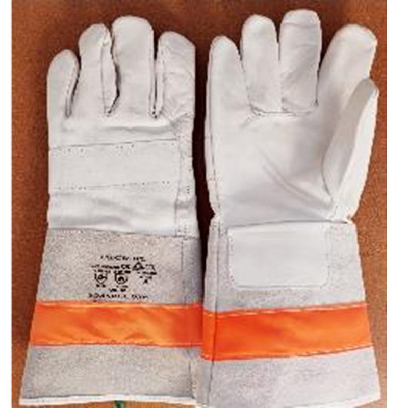 Zaštitne rukavice za zavarivače, CE/CW-1 FL SIMARGL W05 proizvedene od bele i goveđe kože sa oranž detaljim na krutoj manžetni od govedjeg špalta. Dužina 35 cm. Imaju tekstilnu postavu. Sertifkat za zavarivanje tip A.